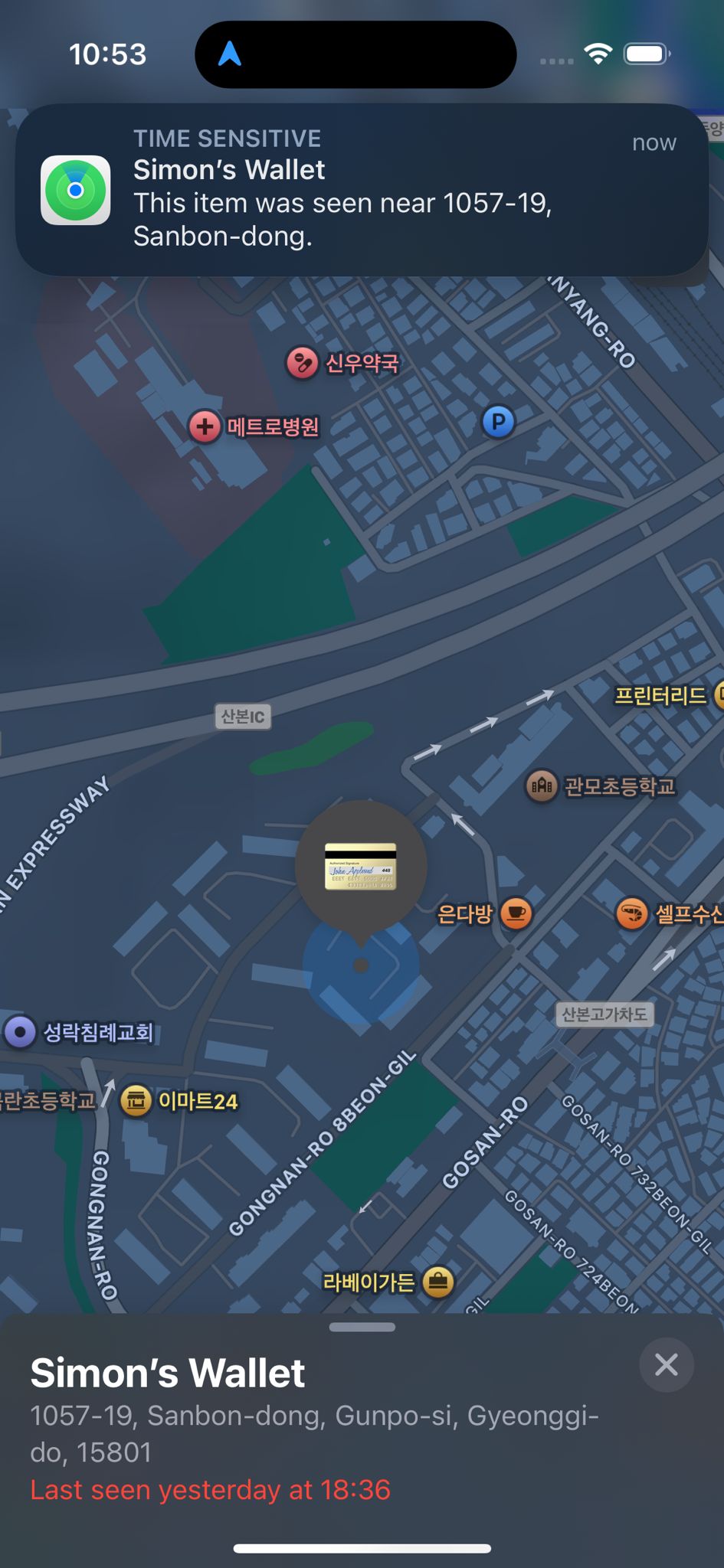 "ํ๋, ๋ด ํด๋ผ์ด์ธํธ๊ฐ ์ง๊ฐ์ ์งํ์ฒ ์ ๋๊ณ ๋ด๋ฆฐ ๊ฒ ๊ฐ๋ค๊ณ ํ๋๋ฐ. GPS ์ถ์ ๊ธฐ๊ฐ ๋ฌ๋ ค์์ด์ ์ง๊ธ '๊ธ์ ์ญ'์ผ๋ก ๋์จ๋. ๊ธ์ ์ญ์ ์ฐ๋ฝํด์ ๋ถ์ค๋ฌผ(์ ์ค๋ฌผ) ์๋์ง ์์๋ด์ฃผ๋ฉด ์ ๋ ๊น?"