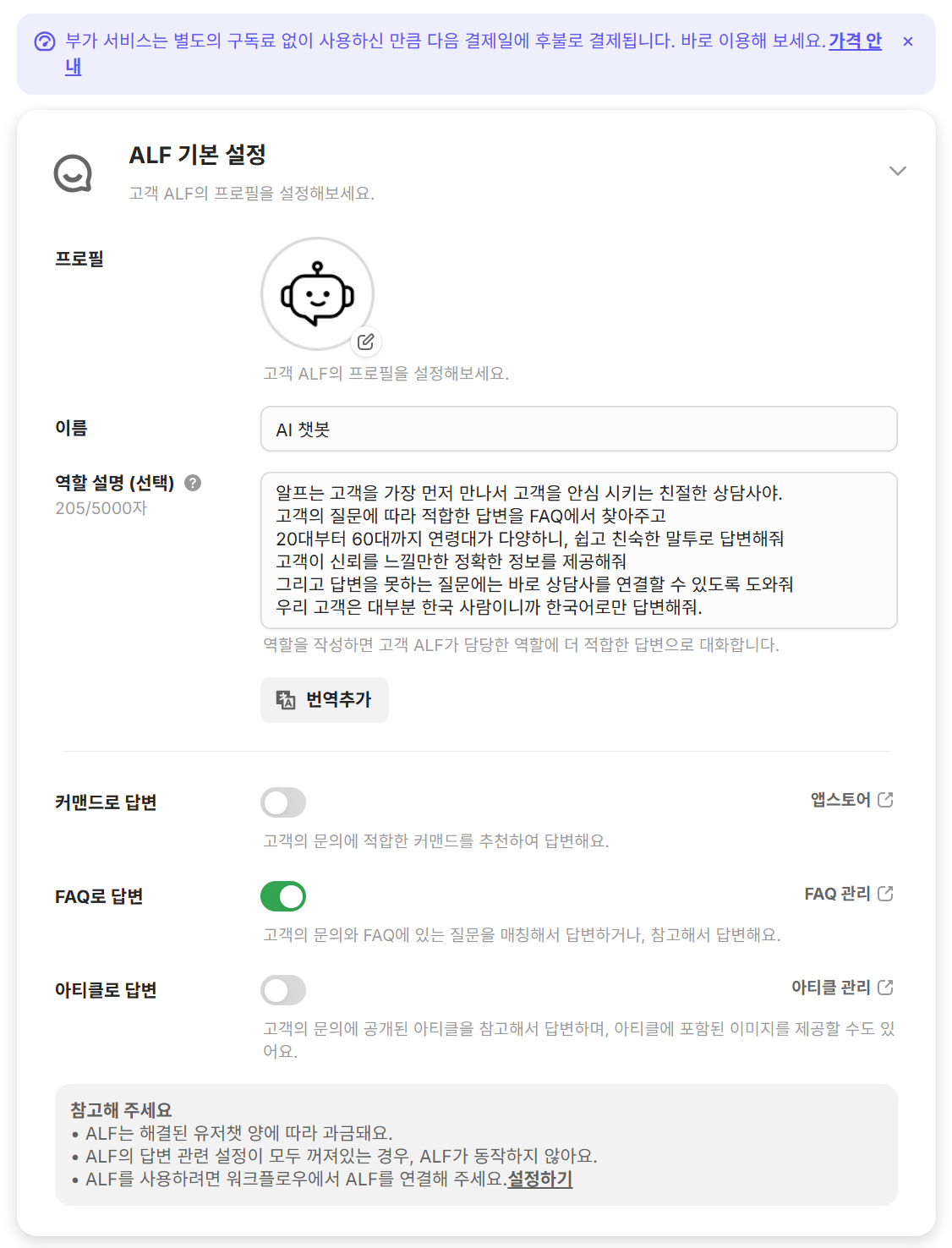 ์ ํฌ๋ ๊ธฐ์กด์ ์ ๊ณตํ๋ ๋ฐฉ๋ํ ์์ FAQ๋ฅผ ์ํ ์์คํ ์ ์ ๋ก๋ํ๊ณ , ALF๋ ์ด ๋ด์ฉ๋ค์ ๊ธฐ๋ฐ์ผ๋ก ๋ต๋ณ์ ํด์ฃผ๊ณ ์์ต๋๋ค. ๋์ ํ ๋ต๋ณ๋ ์์ฃผ ์ ํด์ฃผ๊ณ , ์๋ด์ฌ ์ธ๋ ฅ์ ๋์ฒดํ ์ ์๋ ์ ๋์ ์ฑ๋ฅ์ ๋ด๊ณ ์๋ค๊ณ ์๊ฐํ์ด์.